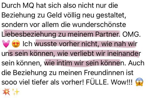 Die Begleitung ist so intensiv gewählt, dass du in den ersten 6 Wochen bereits massive Veränderung spürst. Du empfängst fast täglich Impulse in der Money Queen Gruppe von mir und jede Woche Live Sessions via Zoom, wo du direkten Support von mir zu deinen Themen bekommen kannst - wir sprengen die Blockaden & Selbstsabotage SOFORT. Zusätzlich bist du bei den Calibration Sessions mit Mira vollkommen gesehen und darfst dich hier in den Kreis der anderen Frauen wirklich halten lassen.