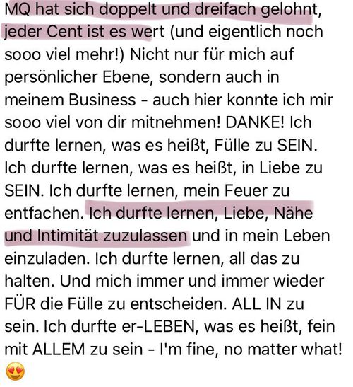 Perfekt! Das Investment darf dich aktivieren und dein Commitment für dieses Mentoring auf Hochtouren bringen. Money Queen ist für die Frauen, die bereit sind ALL IN zu gehen für ihre Fülle & Geld Realität! Bereits deine Entscheidung dabei zu sein und diese Summe in DICH zu investieren, wird kraftvolle Prozesse in Gang bringen. (Hier beginnt schon das Mentoring 🤭)